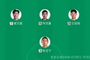 国足vs库拉索的热身赛,谢文能、韦世豪、王钰栋以及张玉宁组成攻击线四人组。在中超前三轮比赛中,谢文能打入2球,韦世豪打入1球,王钰栋和张玉宁各打入3球,两人也在射手榜并列第一位。