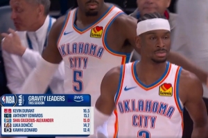 进攻威胁大!本赛季引力值排名 亚历山大15第三 杜兰特16.5榜首