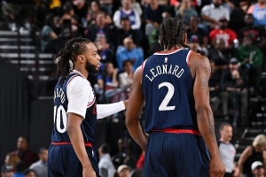 记者提到当加兰和伦纳德同时在场时,球队84%的出手都集中在篮下或者三分线外,对此可以说:“我非常喜欢这个组合,加兰能能够打挡拆,突破到内线并做出正确的选择,科怀(伦纳德)一旦上场就能吸引大量的防守注意力。”