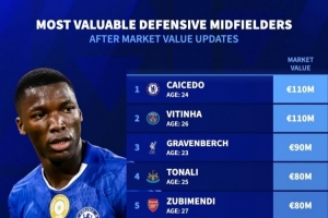 体育资讯4月11日讯 德国转会市场列出了防守型中场(DM)德转身价排名,凯塞多、维蒂尼亚1.1亿欧居首。