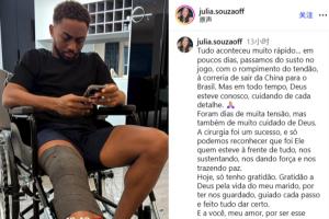 一切来得太突然…这几天从比赛中的惊魂一幕,到肌腱断裂,再到返回巴西接受治疗,尽管匆忙,但上帝一直与我们同在。手术很成功,希望上帝守护我们,给我们力量,保我们平安。